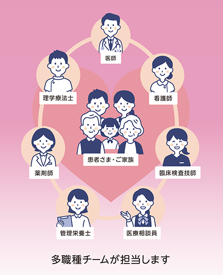 患者さま1人に対し、医師·理学療法士·看護師·薬剤師·臨床検査技師·管理栄養士·医療相談員など、多くの専門職が関わる事は、心臓リハビリテーションの特徴です。